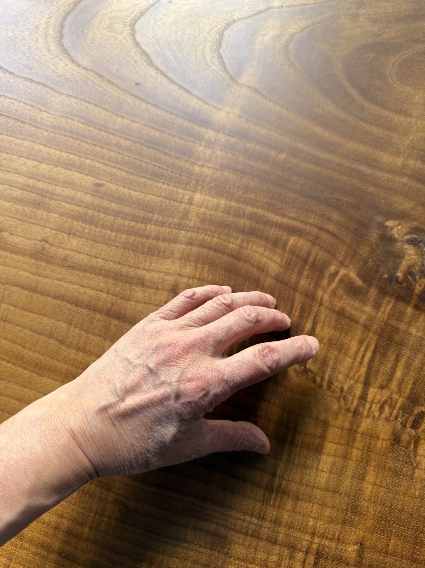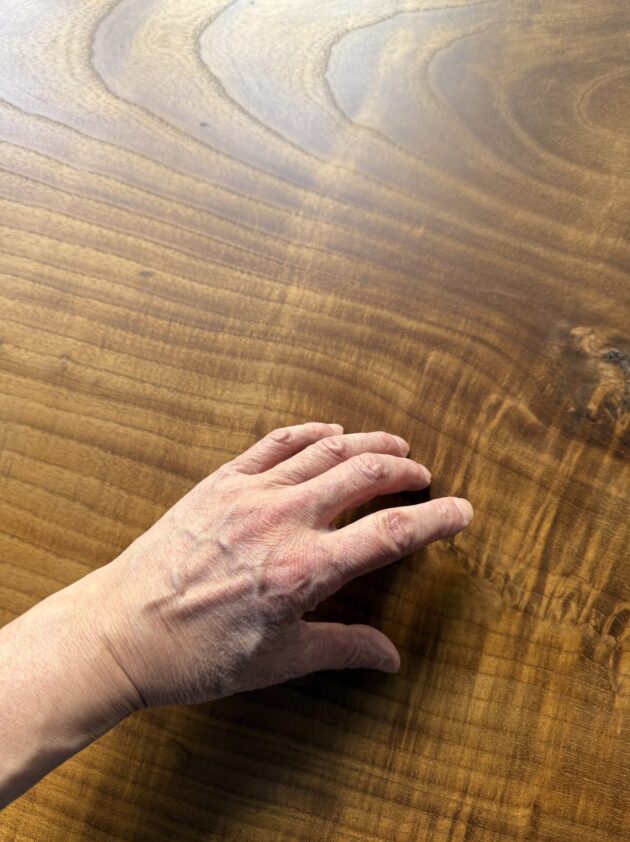 無垢の一枚板のテーブルは 使ううちに表面の色が深くなり 手が触れたところに艶が出て 傷も染みも、時間の模様として馴染んでいく